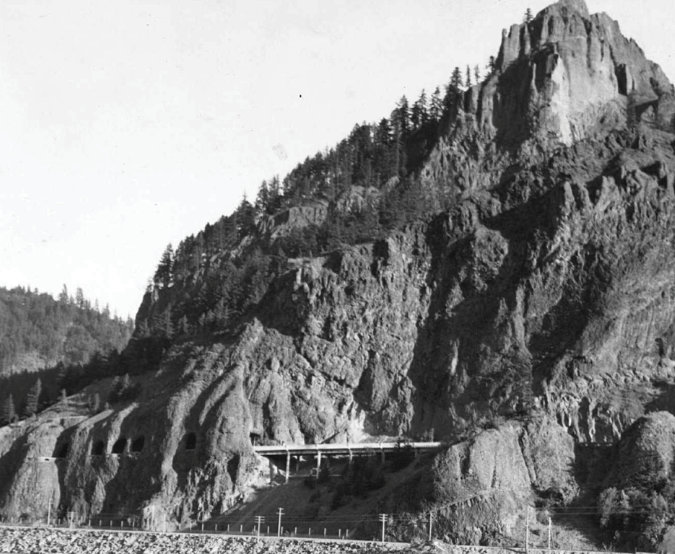 This 1920s view of the original Mitchell Point Tunnel from the Washington side of the Columbia River shows both west viaduct that led to the tunnel and the famous series of windows (on the left). Freeway construction at the base of the cliffs in the 1960s destroyed both the tunnel and viaduct