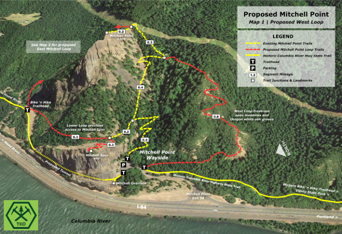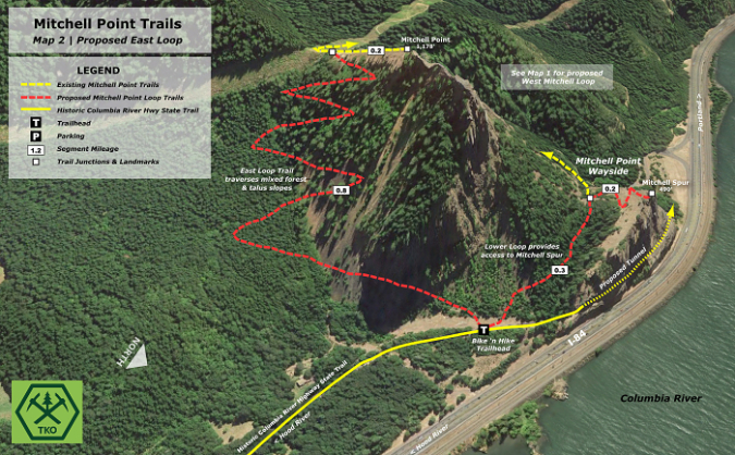 While the new tunnel is certain to draw visitors who simply want to walk its length and enjoy the views, it also offers a terrific opportunity to create loop hikes that build upon the existing Mitchell Point Trail. This steep and difficult to maintain route is more like a goat path, but has become an increasingly popular viewpoint trail as placed like Angels Rest become overwhelmingly crowded. The Oregon Department of Parks and Recreation (OPRD) has already adopted a new loop trail concept for the west side of Mitchell Point that also would provide a better graded approach to the summit, and a loop for those willing to return along the existing, very steep route.
