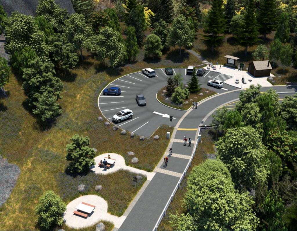 This is an ODOT rendering of the new parking area at Mitchell Point. While it’s surprising to see the fairly new parking lot being reconstructed so soon, the new design does manage to have a smaller paved area while expanding parking spaces (to a total of 18 compared to 16 today) and has a more efficient circulation design. The areas shown with picnic tables were once part of a very large parking area here as recently as 2012, so it’s disappointing that this design doesn’t better accommodate demand by included more spaces in that area (ODOT)