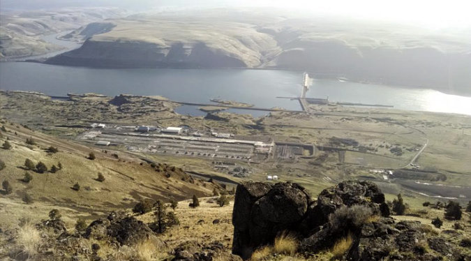 The defunct, polluted aluminum plant at John Day dam (seen far below in this view) is proposed to hold the lower reservoir for the closed-loop energy system. This view is from the crest of the Columbia Hills, on sacred tribal land 2,000 feet above the river, where the upper reservoir would be constructed (Portland Business Journal)
