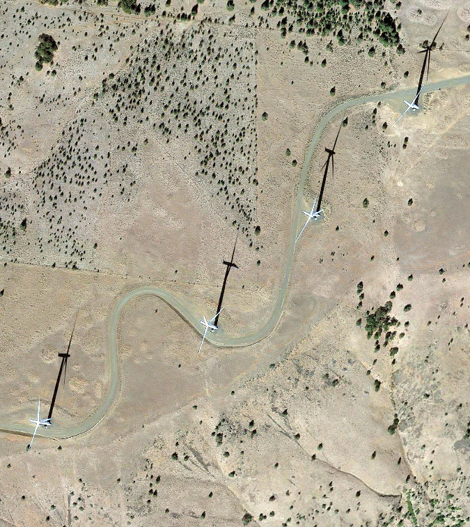 The towering wind turbine that now line the Columbia Hills above John Day Dam are aggressively marketed as benign sources of clean energy, and yet each turbine requires a new road to be built, leaving a permanent scar on the land and introducing invasive plants to the largely pristine desert landscape. This snaking section of road in this view is on sacred tribal land near the proposed Columbia Hills Energy Project (Google Earth)