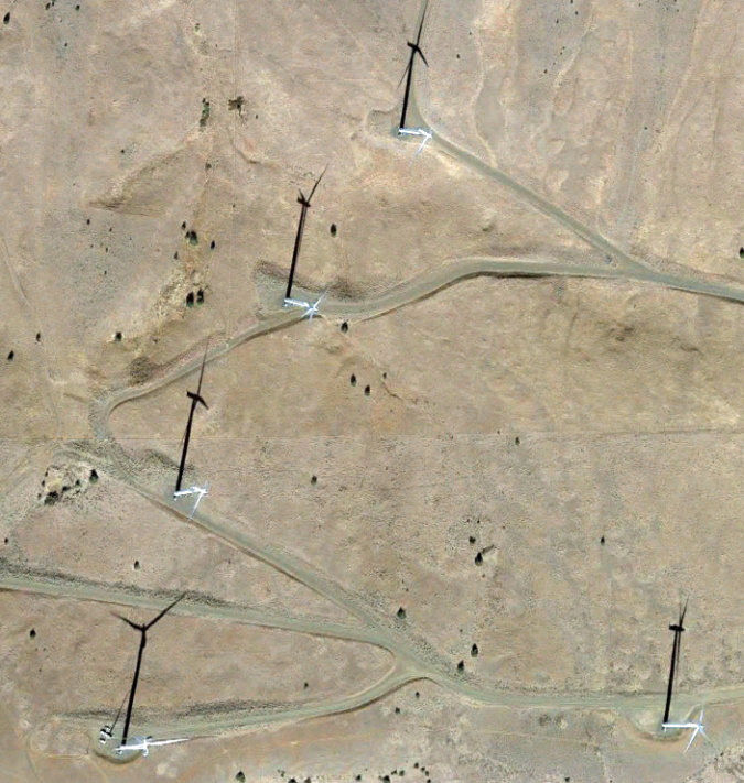 The service roads built for these windmills on the crest of the Columbia Hills resemble suburban cul-de-sacs, each cut into desert ground that had never even been plowed, and has provided tribal first foods for millennia (Google Earth)