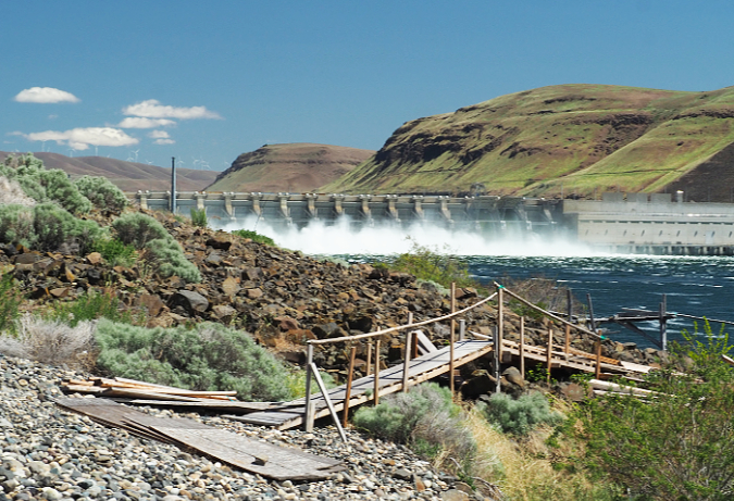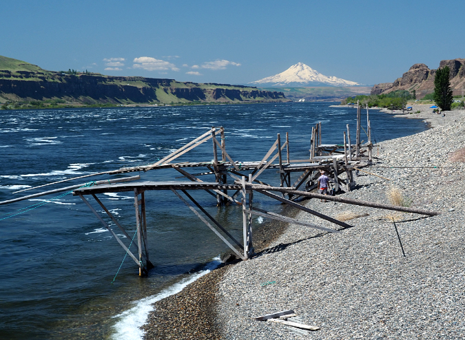 The ancient and sustainable trumped by the new and industrial: the 1971 John Day Dam dwarfs traditional tribal fishing platforms, located just downstream from the dam
