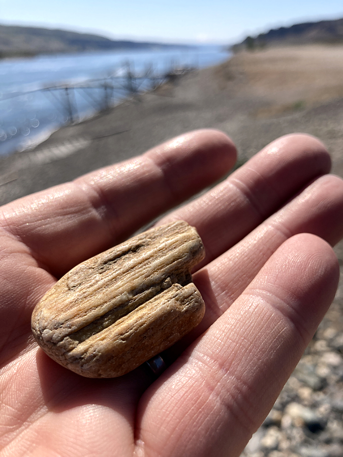 The vast, colorful pebble beaches in the east Gorge were left here by ice age floods that brought rock from the northern Rocky Mountains to the Columbia River Gorge. This river-worn piece of petrified wood is typical of these deposits