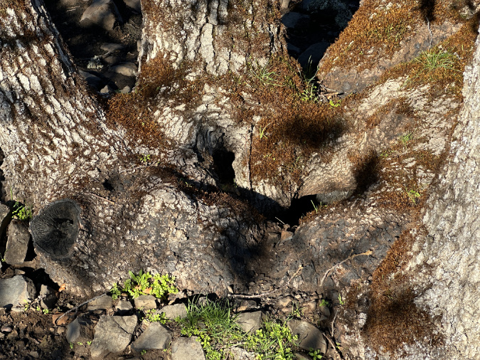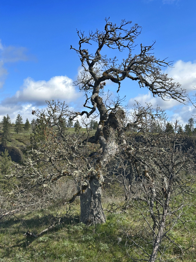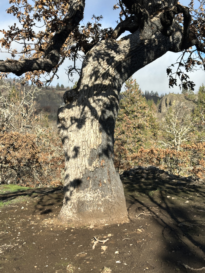 …and a still-closer look reveals a hole at the center that marks this as a tree that rebuilt itself from surviving roots decades ago with the original trunk – now gone — was likely killed in a wildfire. This tree is living example of how our Oregon white oak have completely adapted to fire as an essential part of their ecosystem, periodically rejuvenating the landscape.