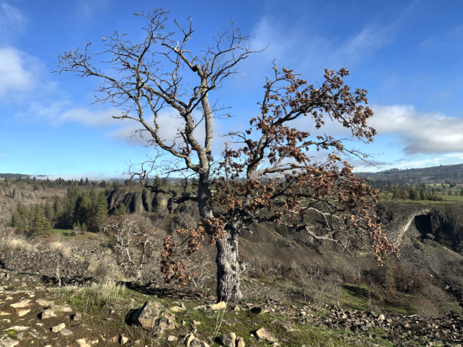 This oak along the west Catherine Creek rim has a good chance of surviving the fire. Browned foliage marks the parts that were likely killed by the fire, but the bare upper canopy is a sign that at least part of the tree survived long enough to drop its leaves normally in fall.