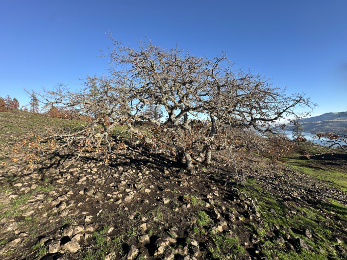 While the keystone Oregon white oak groves along the Labyrinth Trail (in the first installment to this series) had already begun to recover over the fall months, the oaks in the West Catherine Creek area fared poorly, most having already endured the Top of the World fire. Few were showing any sign of rebound since the Burdoin as of December, though we won’t know until spring foliage emerges in late April just how impacted these trees are.