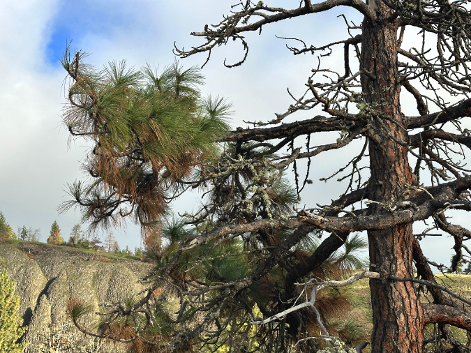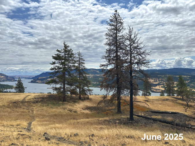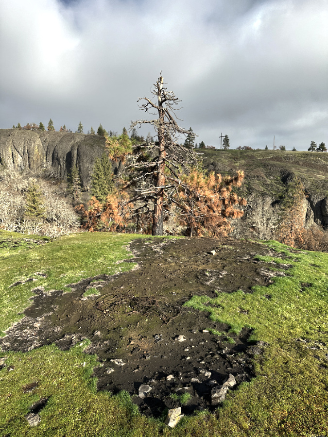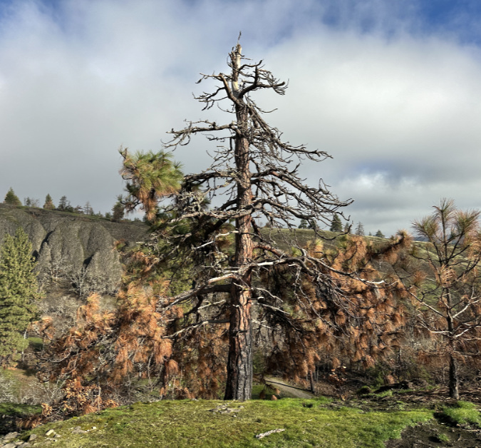 As described in this article, the rocky margins of Rowland Rim were spared in the 2024 fire, but burned in the second event, killing some of the most iconic “krummholz” trees in the area. However, the fire seemed to lose intensity as it reached the west rim of Catherine Creek canyon, and several of the iconic Ponderosa that burned in this area stand a chance of surviving. This could be due to the lack fuel from brush and dry debris that had already burned in the 2024 fire.