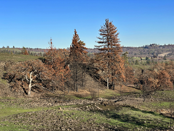The fire burned hot enough to completely blacken the leaves on the lower limbs of this tree. We won’t know until spring if trees like these somehow survived the fire.