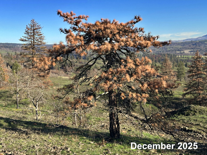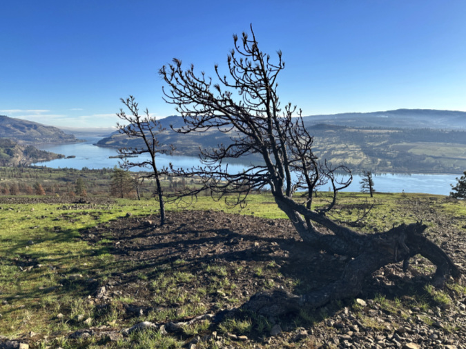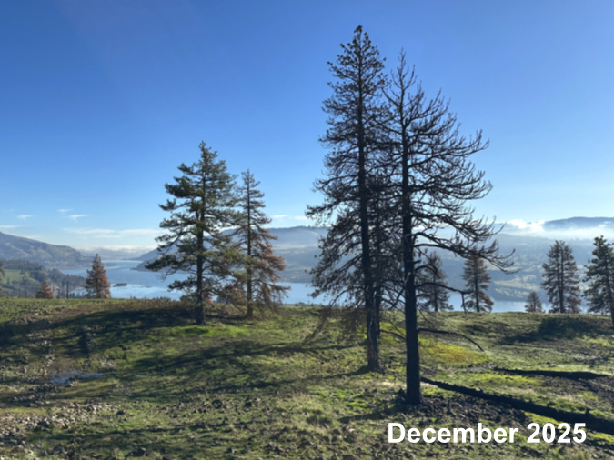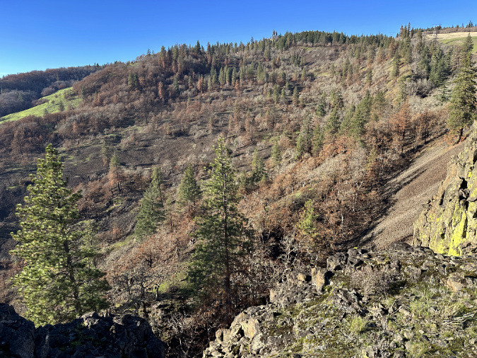 Some of the most intense burning at the West Catherine Creek savannah was along the lower slopes that didn’t burn in the 2024 fire. Here, the dense understory and buildup of debris burned hot enough to completely kill this mixed grove of Ponderosa pine and Oregon white oak.