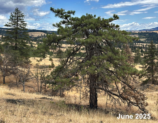 This grove of Ponderosas was hit hard by the 2024 fire due to a buildup of fallen logs and other dry debris, and tree canopies that extended to the ground. The pair of pines on the left survived the first fire, while the heat from the two fallen logs killed the tree on the right and appeared to have doomed its neighbor, at center. This photo is from just a month prior to the Burdoin Fire, showing the already tinder-dry grasslands last summer.