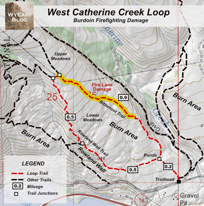 This second installment examines the central part of the fire, where it burned across the section known Rowland Wall and the meadows of the West Catherine Creek savannah (shown as subarea 2, below). This subarea is defined by the popular Rowland Wall-Bitterroot trail loop, shown in purple on the map.