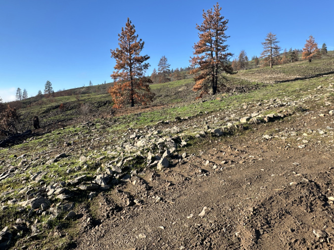 On the day I visited in mid-December, hikers following the Bitterroot Trail were already attempting to navigate the bulldozer track, slipping on loose cobbles, through mud holes, or heading cross-country to avoid the mess, and thus further impacting the meadows. Like me, many were probably encountering the destruction for the first time on a day when they were already absorbing the impact of the fire on the ecosystem. It was hard to watch.