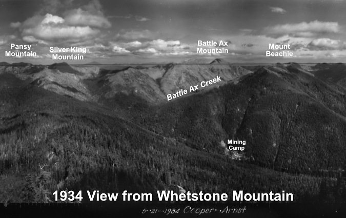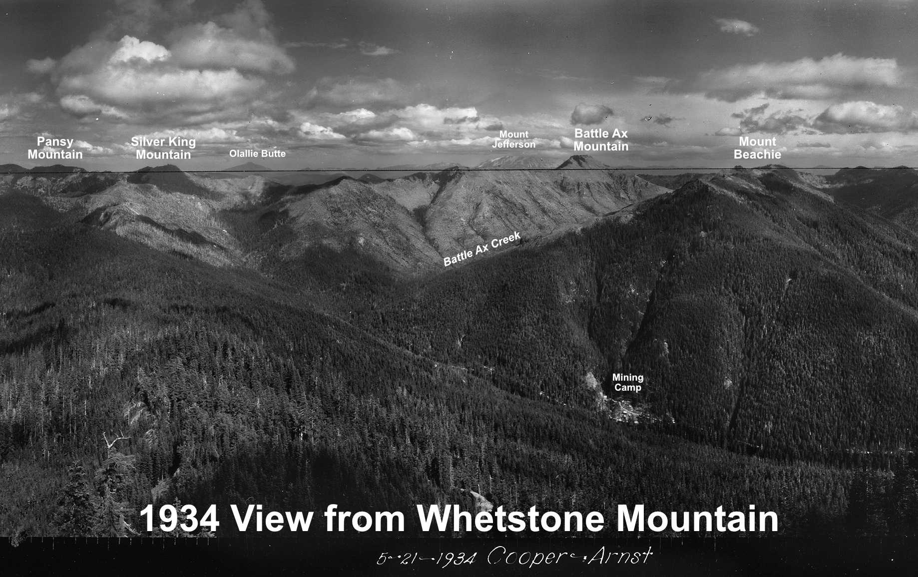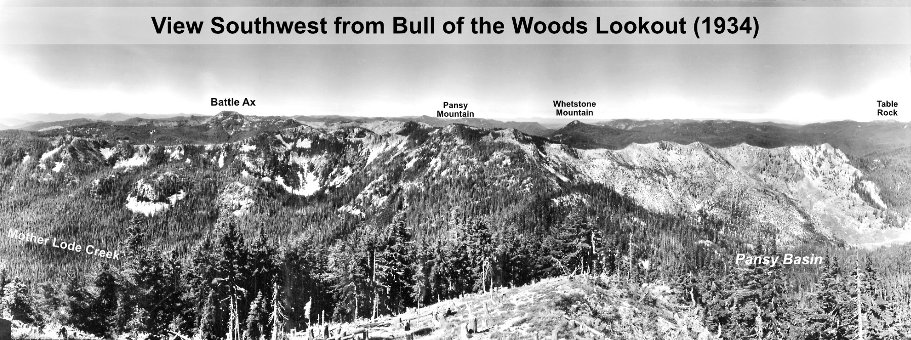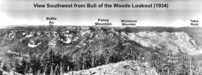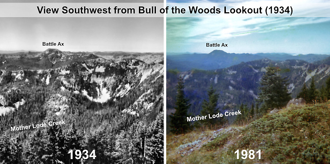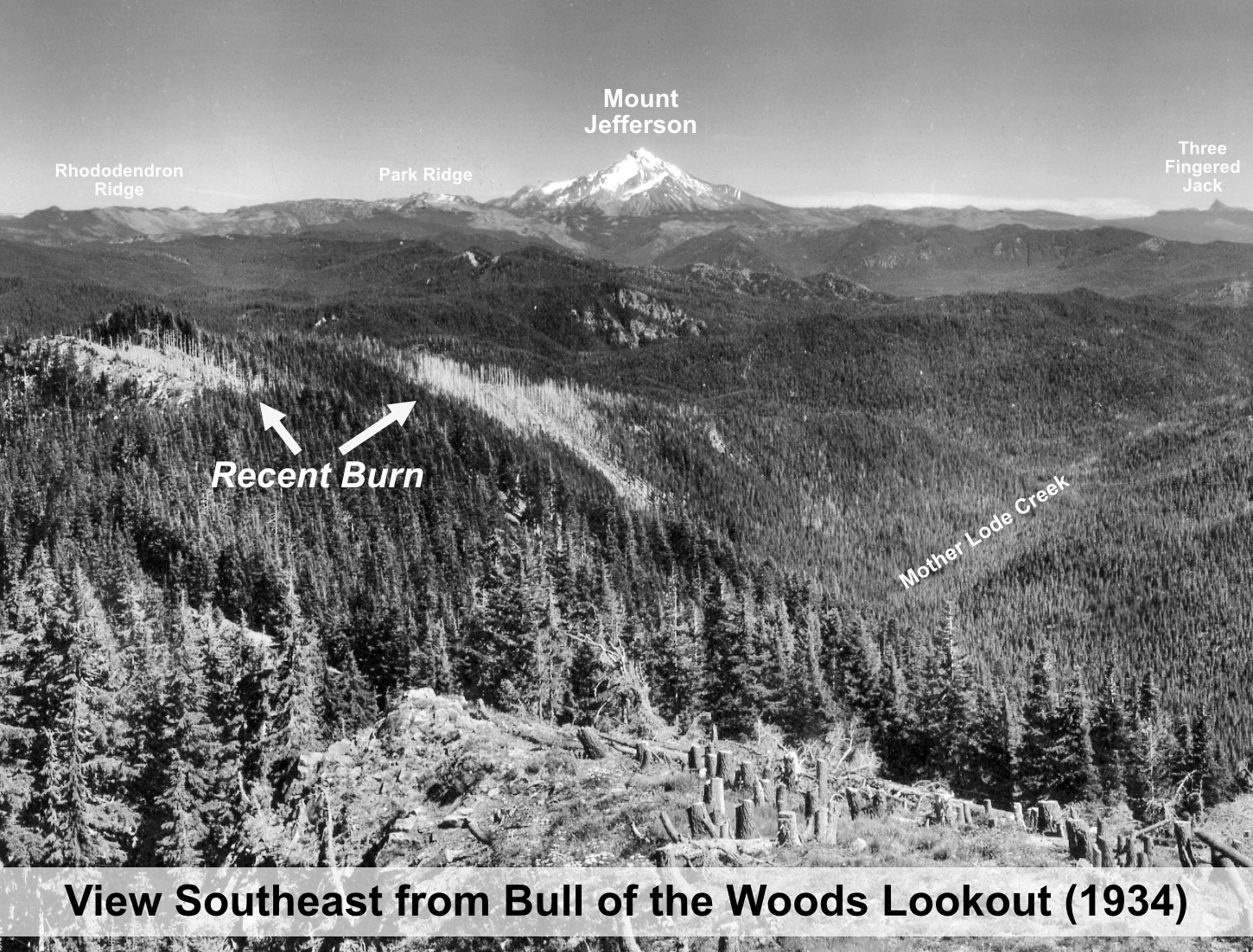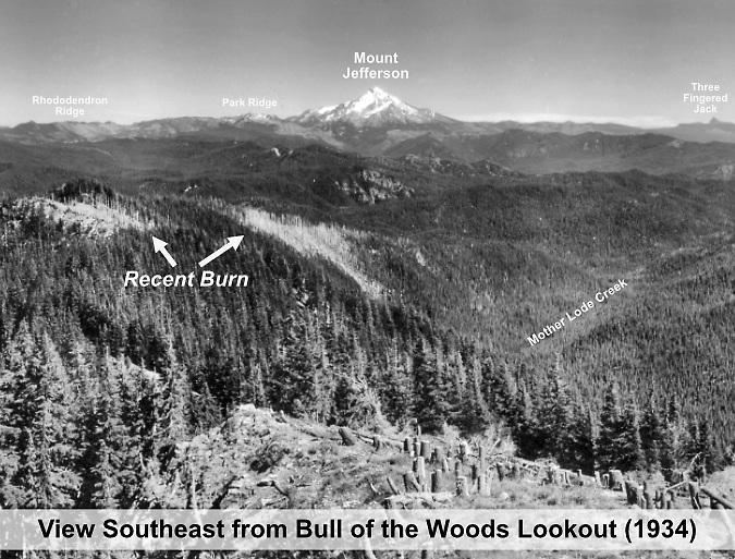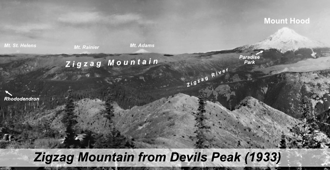 The view from Devils Peaks in the 1930s looked much different than today. The peak, itself, had recently been burned over in the Kinzel and Sherar fires, while the area north along Zigzag Mountain was also burned in a series of very large fires in 1904 and 1910 – including the Burnt Lake Fire