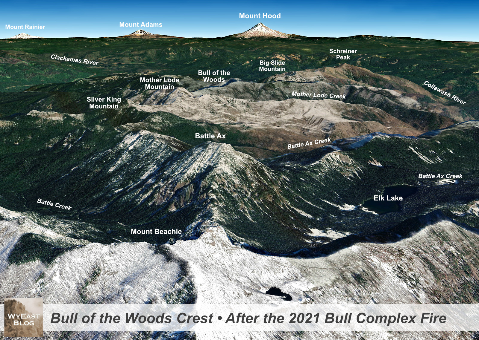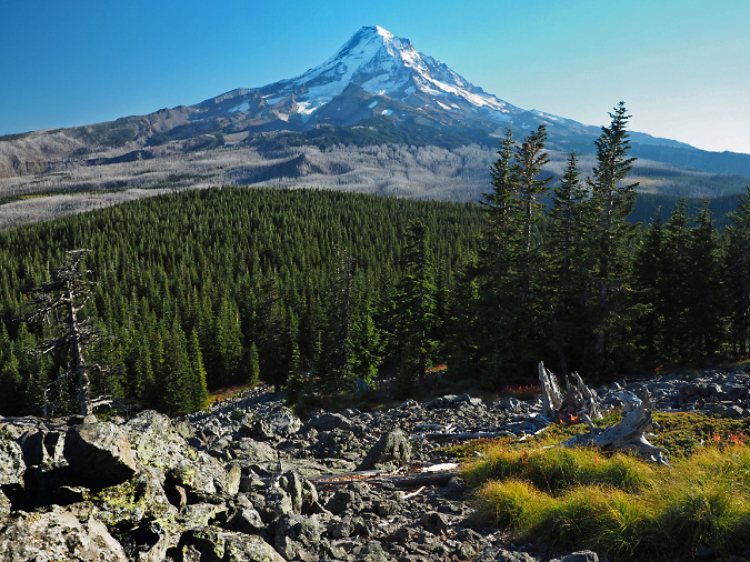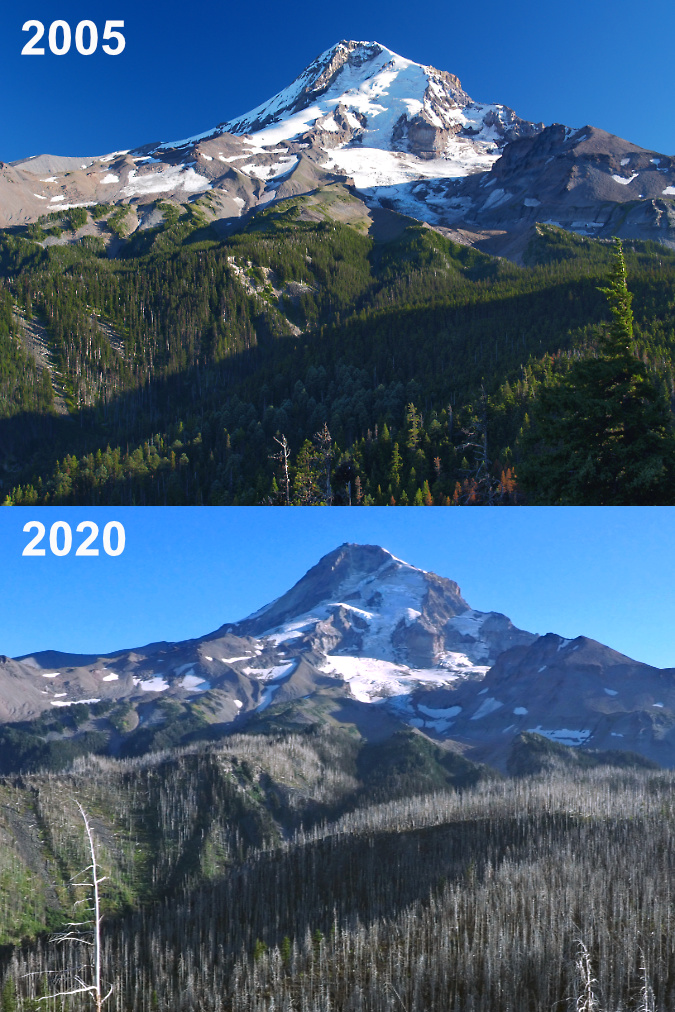 We’ve seen a string of three major fires in the Mount Hood Wilderness in recent years that have completely altered the forests on the north and east slopes of the mountain: the Bluegrass Fire (2006), Gnarl Fire (2008) the Dollar Lake Fire (2011) all burned hot across thousands of acres of subalpine Noble fir, Mountain hemlock and Western larch at an unsustainable pace, leaving large expanses of ghost forest that are only beginning to regenerate today.