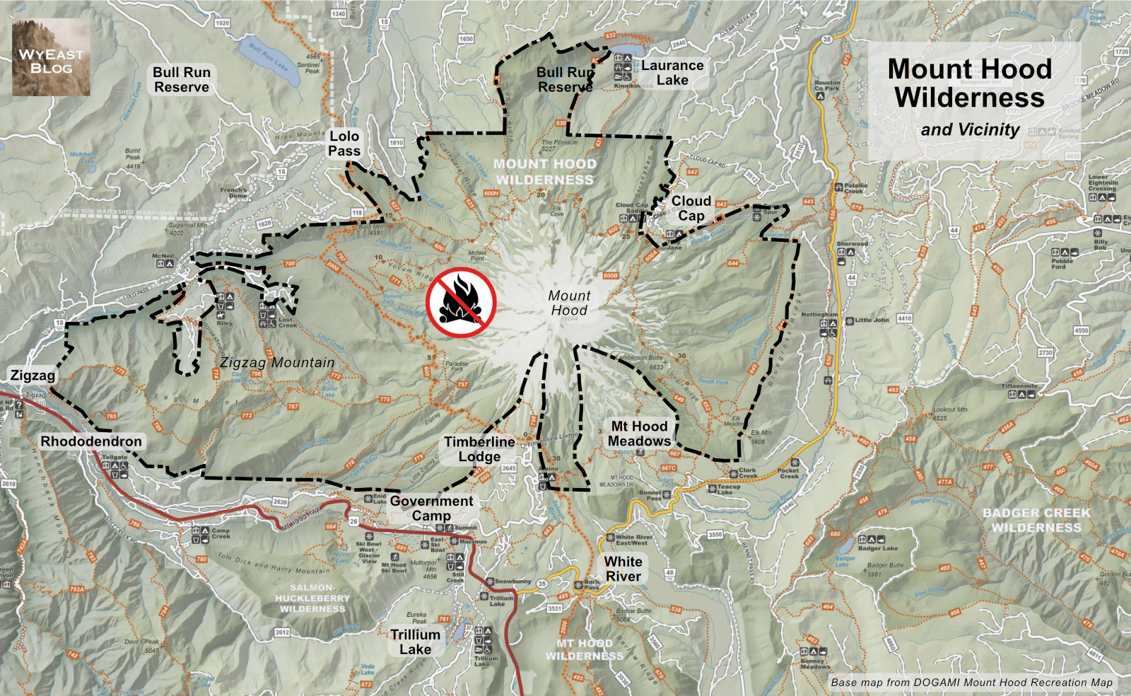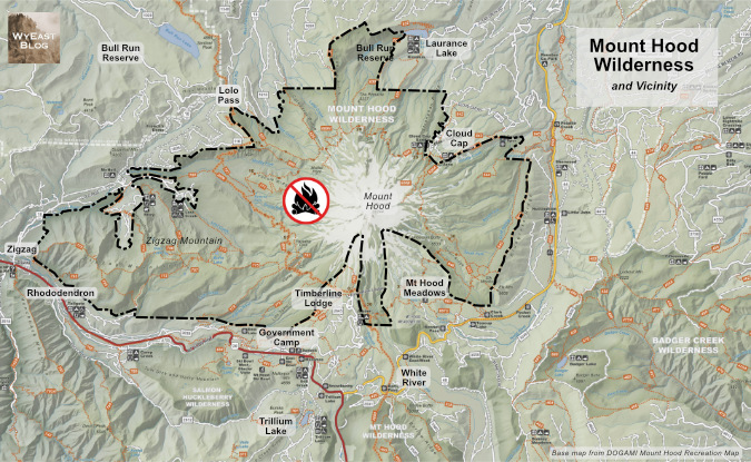Where would this ban apply? Everywhere inside the Mount Hood Wilderness boundary shown below. The wilderness has been expanded several times since the “Mount Hood Primitive Area” was first designated as wilderness in 1964. This is the current boundary where the campfire ban would apply – and including a ban icon on maps like this could be still another helpful reminder for visitors: