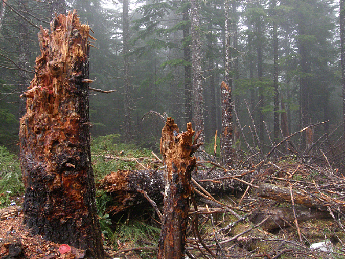 This fire had been built on top of Bald Mountain, more than a mile from the nearest water source. It is typical of new campfires in the Mount Hood Wilderness. Lacking a saw, campers simply burned the ends of uncut logs and limbs, often several feet in length. With no fire ring, even the small limbs are spilling out of the campfire, in effect creating lit fuses for this fire to spread to the dry forest duff in all directions – as it already had when I took to photo. The half-burned stump adds to the risk, as it could smolder for days without being properly extinguished.