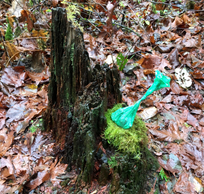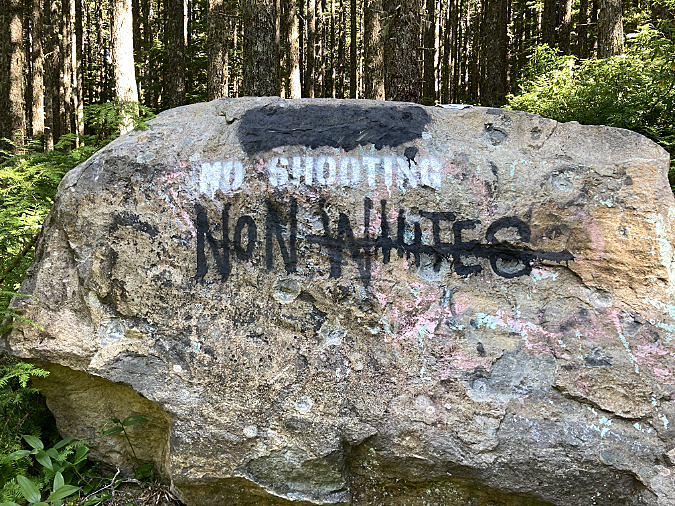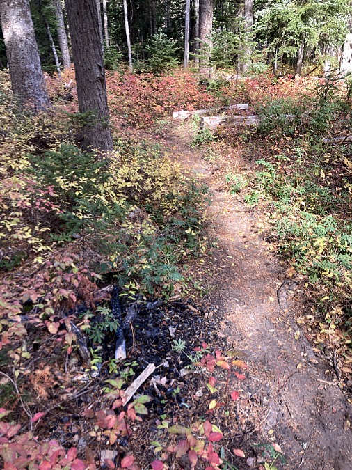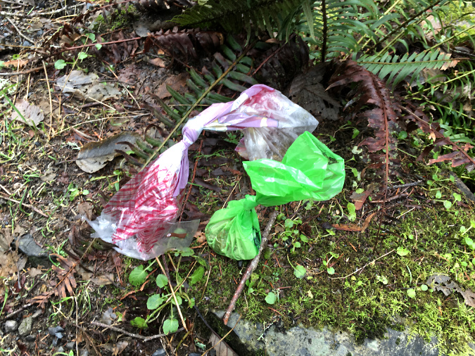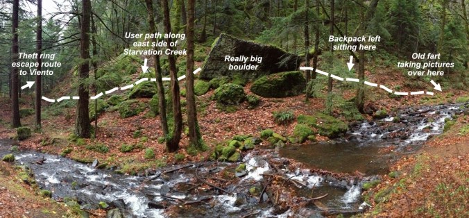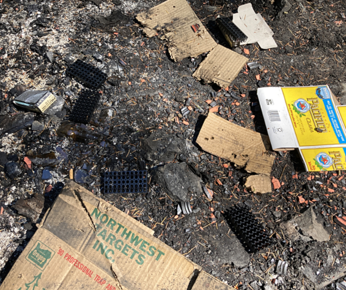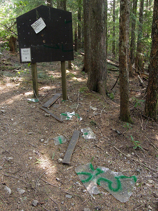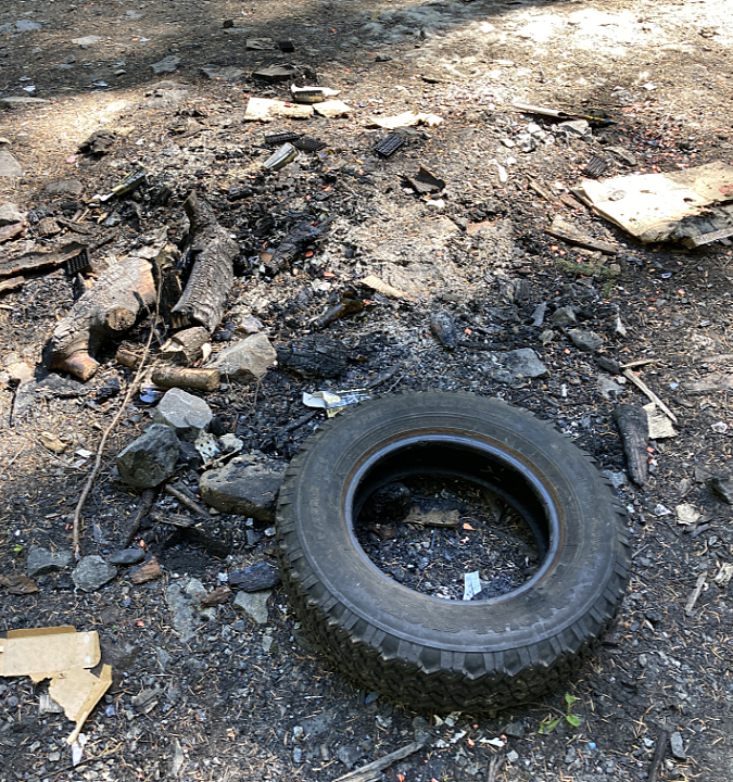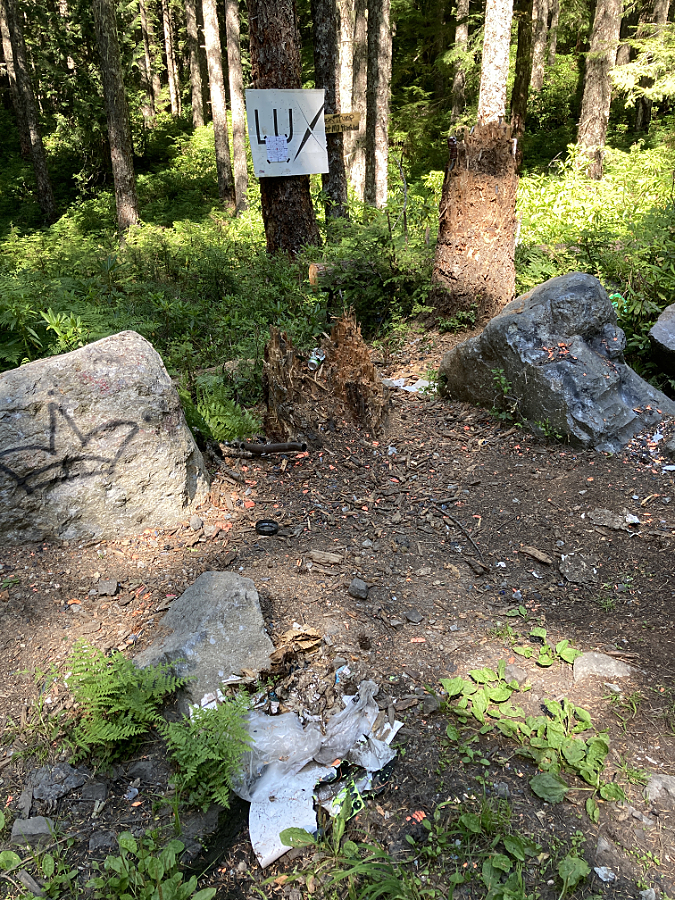Not even a fire ring here, just a campfire built on top of the underbrush and forest duff layer along the Newton Creek Trail. It’s dumb luck this fire didn’t spread – likely due to fortuitous wet weather arriving that fall. Note the half-burned limbs left in the pit – how long did they smolder before the rains put this fire out?