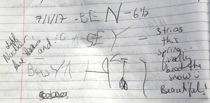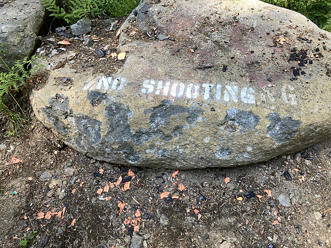 In the intervening years since these photos were taken in 2014, I’ve disassembled and decommissioned this fire ring repeatedly, as the charred boulder seems to attract ever more campfire building at this spot. However, this year things seemed to escalate sharply. This was the scene in late July: