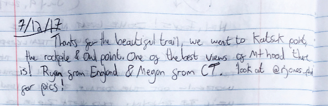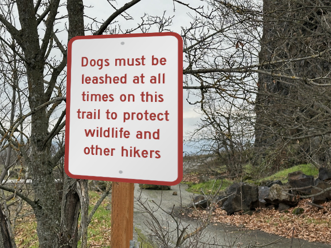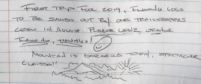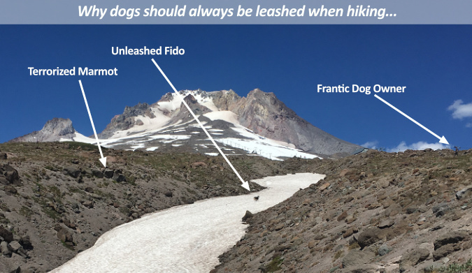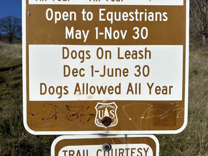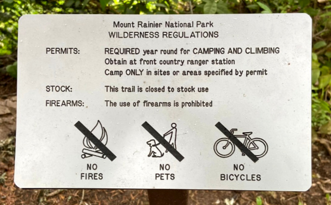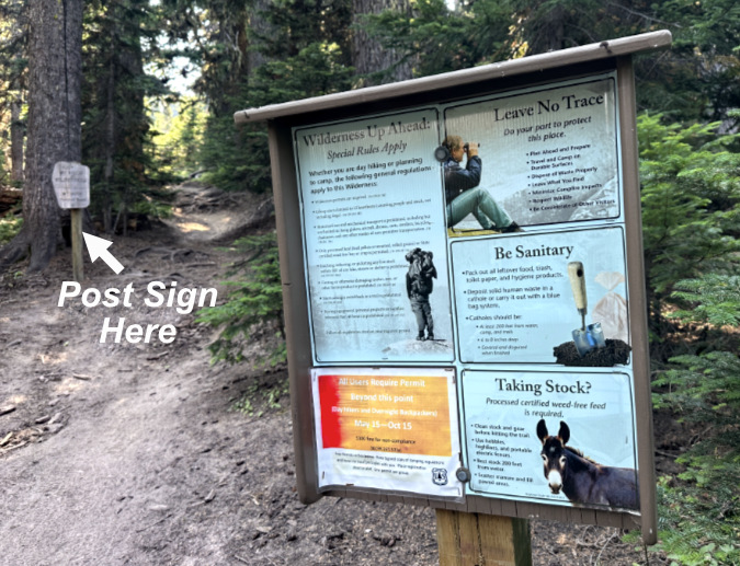 Keep it simple and direct. To ensure visibility, a sign like this should be posted away from the information overload of the main signboards and directly below the wilderness boundary markers that that are typically the last sign a hiker passes when entering the wilderness. Again, this example is from Cloud Cap, where you can see the wilderness marker in the distance, just up the trail: