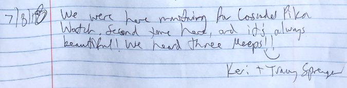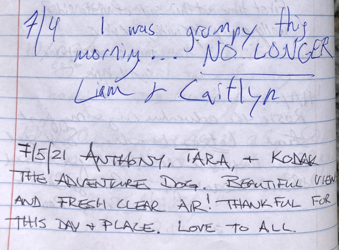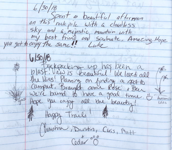 However, there is no water source anywhere near the shelter, so it’s not an ideal camping spot. It’s an even worse place to build campfires. Most campers at the shelter do abide by this obvious ethic, but the few who don’t leave a permanent record of their visit for all who follow in this very popular place. That’s because, beyond the lack of water to reasonably extinguish a fire, there’s also a lack of firewood… except for the federally-listed, threatened Whitebark pines that cling to life here, at nearly 7,000 feet elevation.