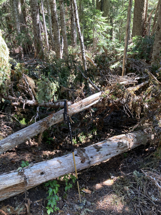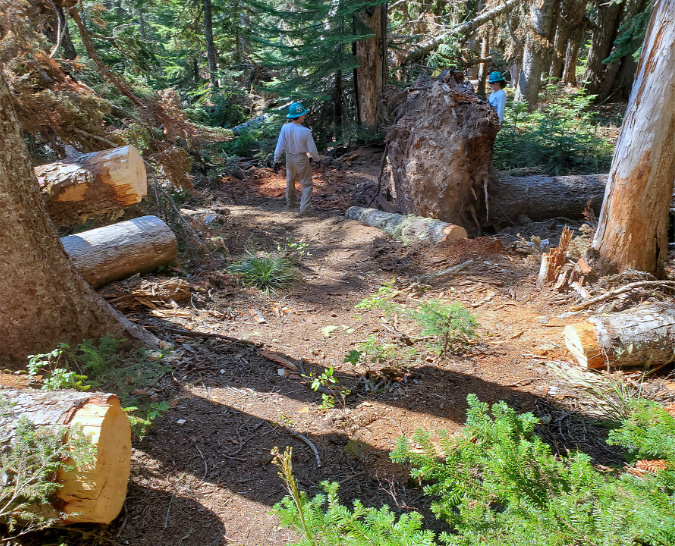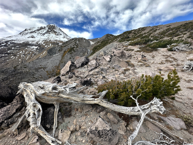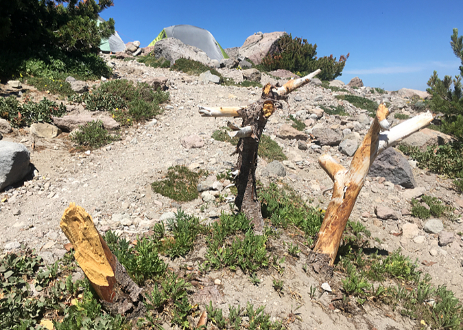 Once the cutting starts, it’s hard to stop. This butchered Whitebark pine had the misfortune of taking root near the Cooper Spur Shelter, perhaps before shelter and Timberline Trail even existed. It was still living as recently as 2020 (when these fresh cuts had been made), even as novice hikers continued hacking it apart for firewood too green to even burn
