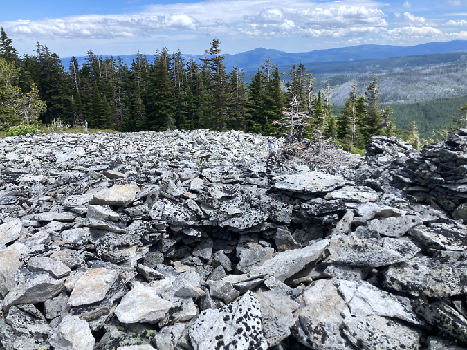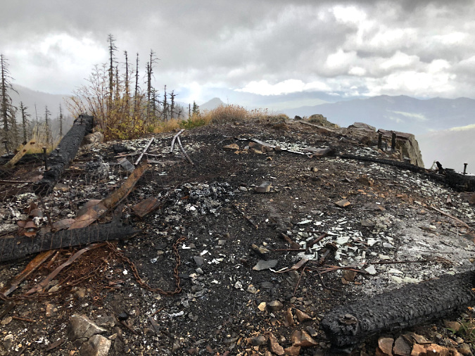 Mature limbs from Whitebark pine in a large fire pit on the summit of Lookout Mountain, in the Badger Creek Wilderness