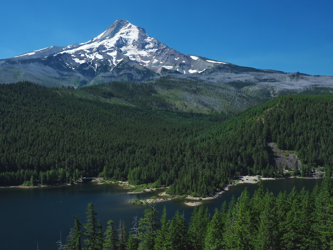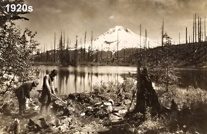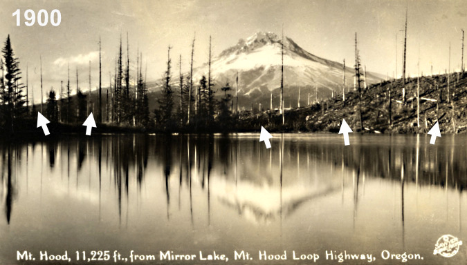 While the surge in recent wildfires on Mount Hood has focused on the east and north sides of the mountain, the west and south sides were the main focus of wildfires in the early 1900s. This view is of Mirror Lake in about 1900, when much of the area south of today’s US 26 had burned in the Kinzel fire