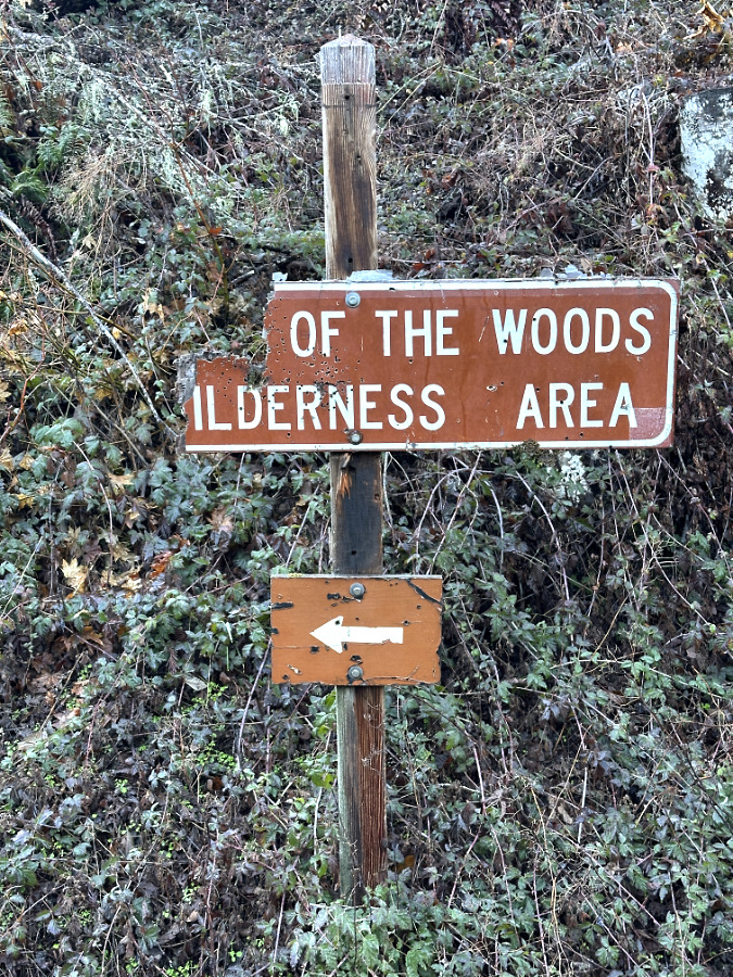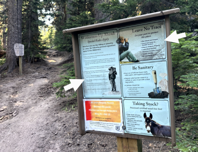 A second sign at the Cloud Cap wilderness trailhead provides still more information for visitors. The two arrows point to additional info on campfires…