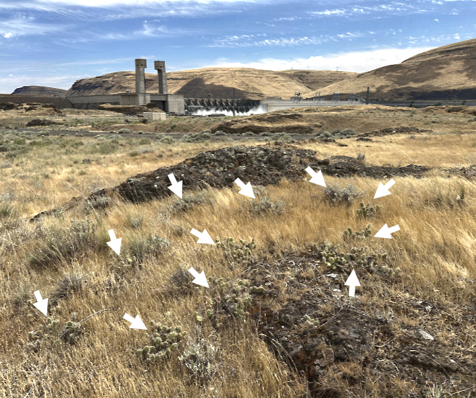 Another new firepit that had been recently built on a dry ridge top on the east side of the mountain, more than a mile from any water source. It was left smoldering, along with burned trash and (circled) cigarette butts that weren’t even dropped into the fire pit – checking two boxes for this fire on the list of most common causes