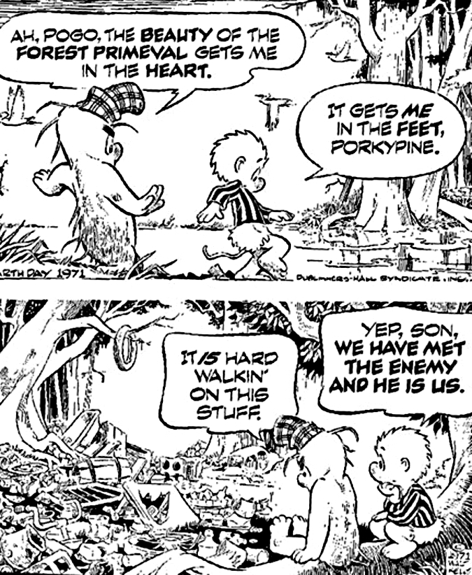 You would be hard-pressed to find anyone under the age of 40 who knows what the “Sunday funnies” is (or was), much less Walt Kelly’s wise possum named Pogo. On the first Earth Day in 1970, Kelly produced a poster with the now-famous “we have met the enemy and he is us” strip, a play on a lesser-known military quote dating back to the War of 1812. Pogo’s version resonated, and Walt Kelly repeated it in this strip published on the second Earth Day, in 1971:
