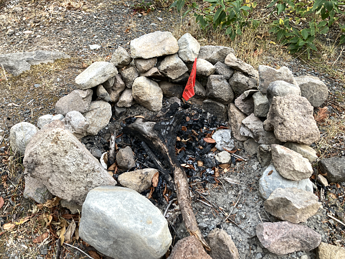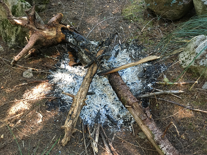 A closer look at the new ring built in the middle of the trail shows half-burned Whitebark pine limbs and an attempt to extinguish the fire by piling rocks on top.