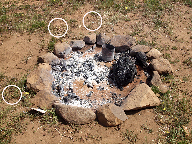 As some of these detailed captions show, new fire rings usually betray their builders. Almost aways, they contain burned foil, cans and melted plastic that a seasoned, knowledgeable backcountry visitor would never leave behind. Half-burned (and often green) firewood is the other giveaway, usually chopped with a hatchet that few experienced hikers would carry. They are also typically built on top of the flammable forest duff layer, instead of an area cleared to bare, mineral soil.