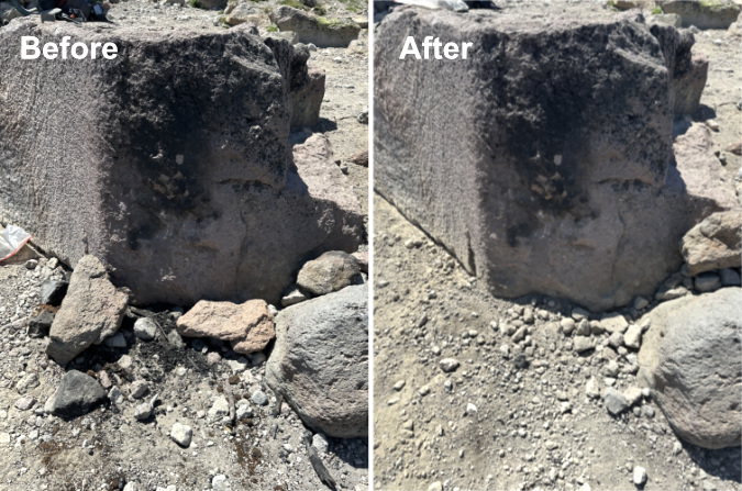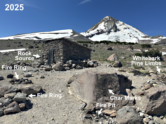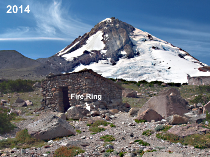 The next photo set in this rogue’s gallery is a case study of the historic Cooper Spur stone shelter on the Timberline Trail, where misguided campfires are a recurring problem. The shelter draws regular overnight campers who, in turn, have built several rock wall windbreaks around tent sites. Not exactly “no trace”, but also not unusual on the mountain. In this case, they must also be viewed in the context of being next to a man-made stone shelter. The hand of man prominent here, however rustic.
