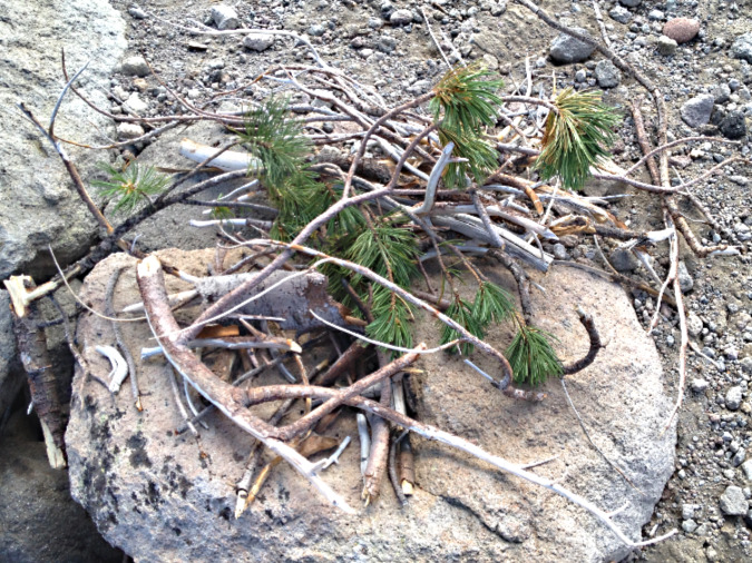 Fuel piled next to the 2014 fire ring includes green limbs pulled from a nearby Whitebark pine, typical signs of a novice