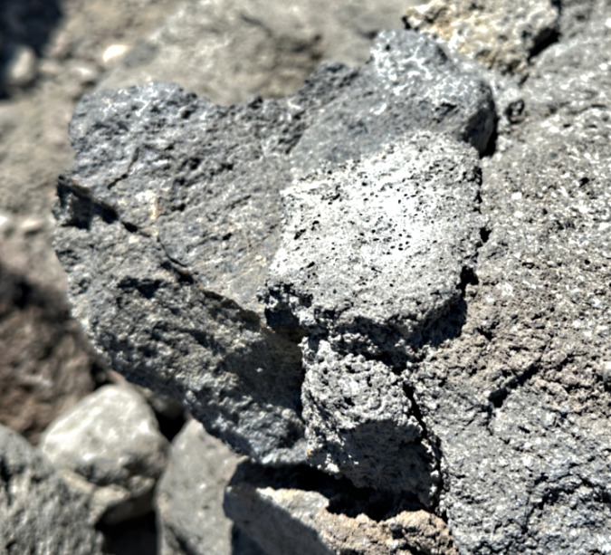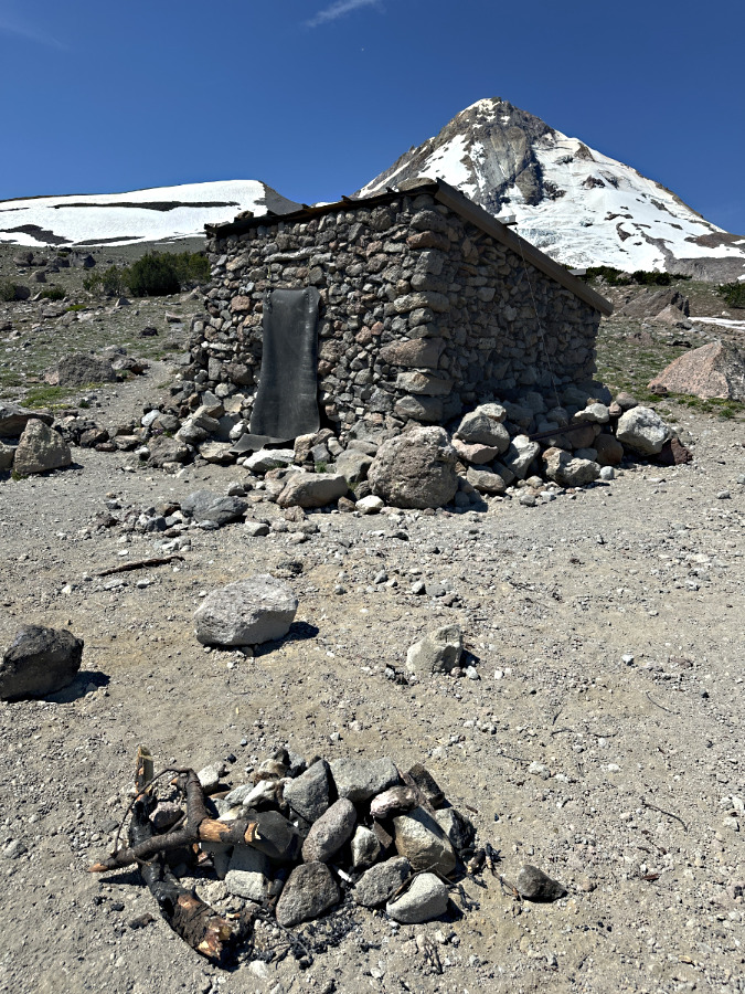A closer look at the new ring shows the rock source to be the recently collapsed corner of the Cooper Spur Shelter – those are mortar traces attached to the rock in this photo. Pure vandalism to use these rocks before they could be to repair the shelter, of course