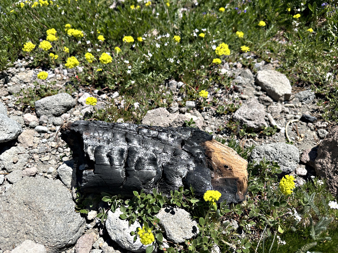 This was among the charred Whitebark pine logs scattered from the three fires, apparently in an attempt to put the fire out? This log was cut with a hatchet, another telltale sign of a novice camper