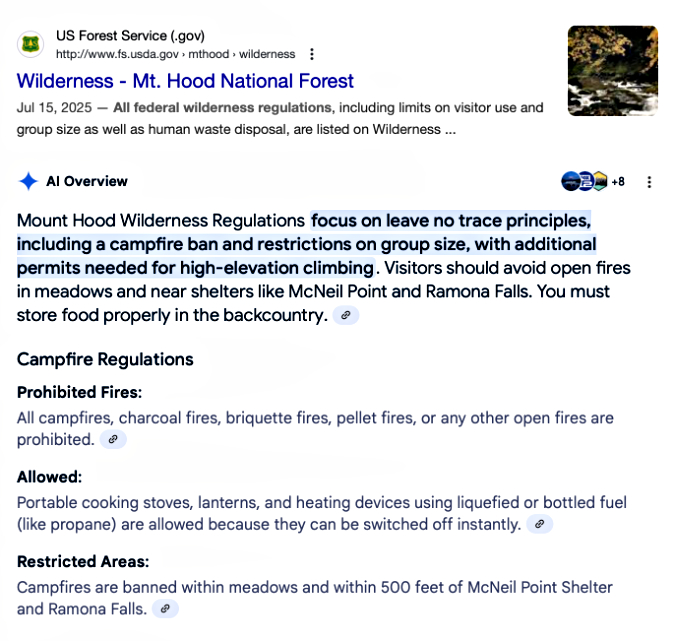 Even a specific Google search for “Mount Hood Wilderness Regulations” takes you to the generic wilderness page for all wilderness areas, where you would still need to track down the buried link to the external page that actually lists the regulations. Few will ever find this information, unfortunately – including Google’s search engine. Google’s AI-powered search provided an even more confusing result, reporting a complete ban on wilderness campfires (!) followed by a partial mention of the actual policy (only for McNeil Point and Ramona Falls):