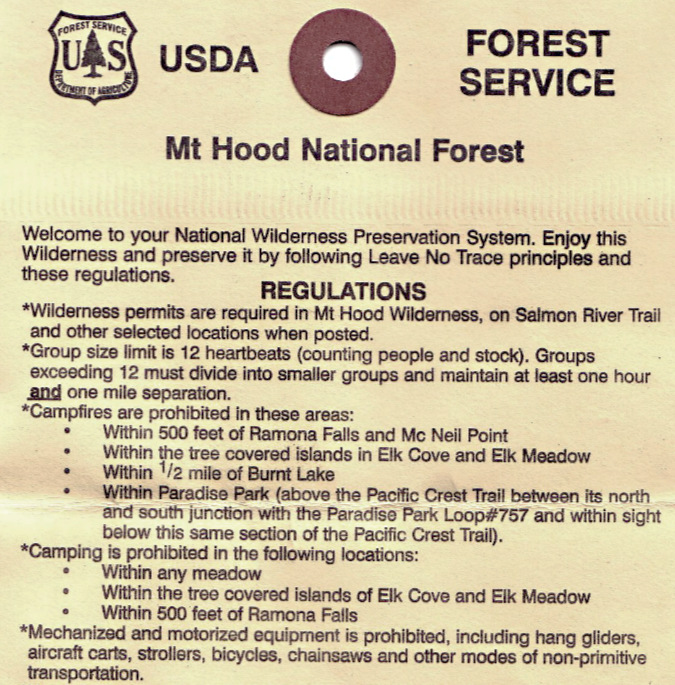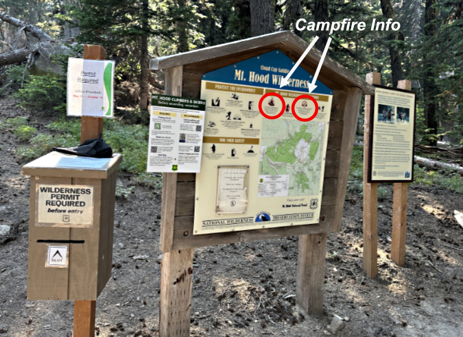 The current, limited campfire ban is also posted on the back of required wilderness permits, which are required at the Mount Hood Wilderness entry points (except this year, unfortunately, due to Forest Service staff cuts):