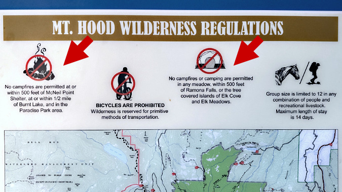 How would the average person know how far “500 feet from the McNeil Point Shelter”, or a “half-mile from Burnt Lake” is? What’s a “tree-covered island” versus a grove of trees at Elk Cove and Elk Meadows? The last rule is especially puzzling, though it seems to describe a near-total ban at Paradise Park. Add in the ever-shrinking number of Forest Service rangers available to patrol the Mount Hood Wilderness, and it’s hard to believe these restrictions are having any real impact as written, however well-intended.