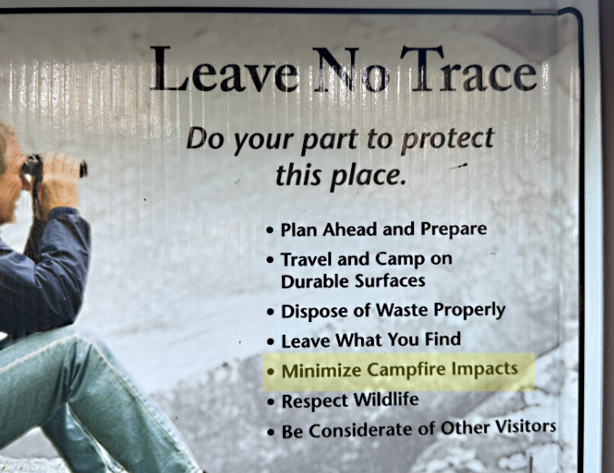 …this enlarged view of the inset on the upper right calls for “minimizing” (highlight added) campfire impacts under the Leave No Trace (LNT) principles…