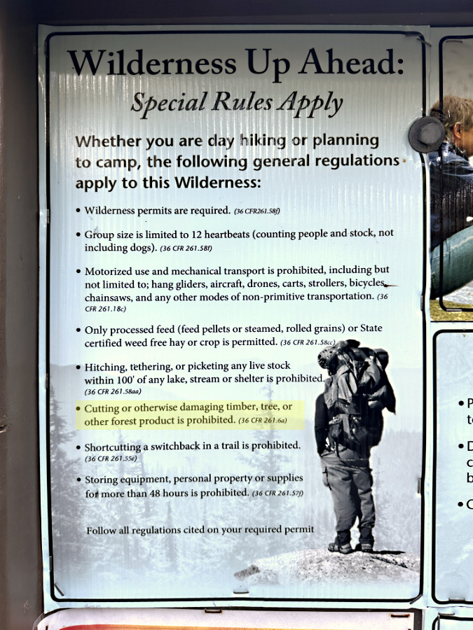 …and the inset on the left side of the second trailhead sign lists special rules for wilderness, including “cutting or otherwise damaging timber, tree or other forest product” (highlight added)