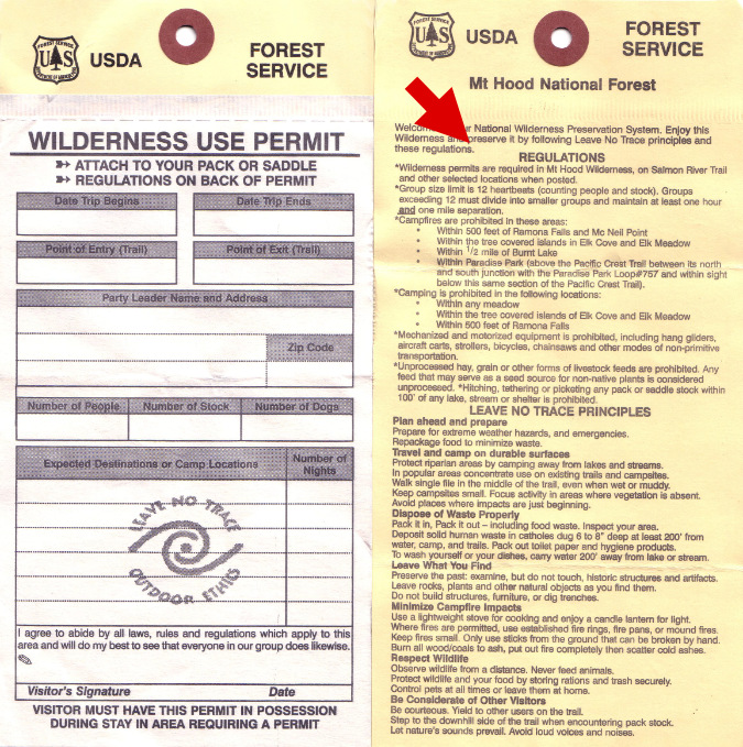 There it is! The red arrow points to the Mount Hood Wilderness regulations printed in full on the back of the permit