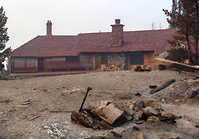 Cloud Cap Inn covered in red fire retardant during the Gnarl Fire in 2008. This historic, priceless 1889 gem narrowly survived the event (USFS)