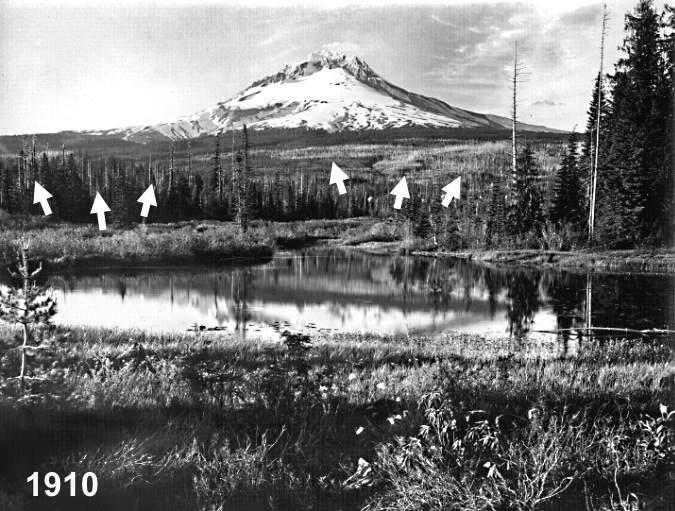This view of the Government Camp area from Multorpor Fen before much development had occurred on the mountain. The arrows point to the ghost forests that marked widespread burns across what are now heavily developed ski resorts and private homes on Mount Hood’s south flank. After more than a century since these fires burned through, the south side of the mountain is primed for a major wildfire