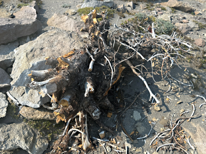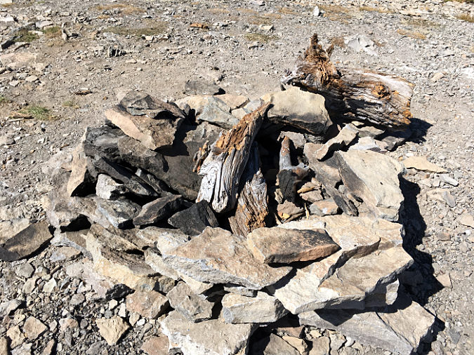 What’s left of this Whitebark pine near the three new fire pits at the shelter shows signs of limbs being sawed, chopped or simply broken off. The stumps still have their bark, so it’s unclear if this was a living tree when it was targeted for firewood