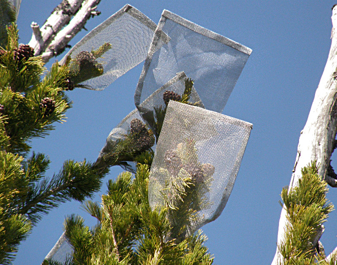 Seed collection bags on one of Mount Hood’s selected Whitebark pines for genetic research