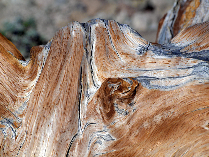 Constant sculpting of this ancient Whitebark pine on Gnarl Ridge from blowing sand and ice crystals prevents the it from oxidizing to grey before it is sanded away, continually revealing the underlying color of the wood