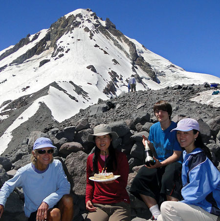 For the August calendar image, I selected a familiar view of Mount Hood from high on the shoulder of Cooper Spur (below). The Eliot Glacier dominates the view here, even as it recedes from global warming. As the glacier recedes, the exposed canyon floor once covered by ice has rapidly eroded, which in turn has begun to destabilize the moraines that flank the canyon.