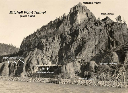 At the time of the Warren Falls diversion project, the railroad was located adjacent to the highway (it was later moved onto fill in the Columbia River when the modern I-84 alignment was built in the 1950s).